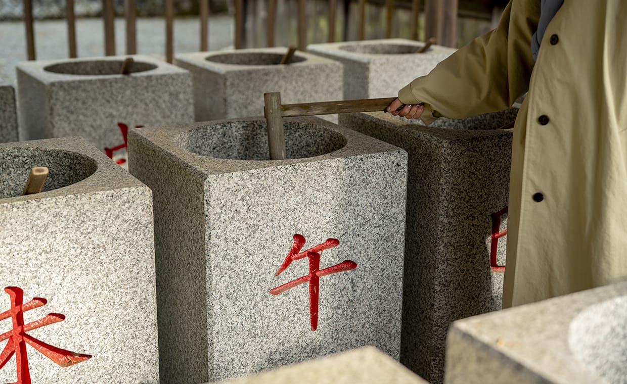 拝殿横にあるのは、自分の干支の臼にお志を納め、願い事を込めて年の数だけ杵で臼をつくと願いがかなうと言われている「願い臼」。お参りの際はぜひトライを!