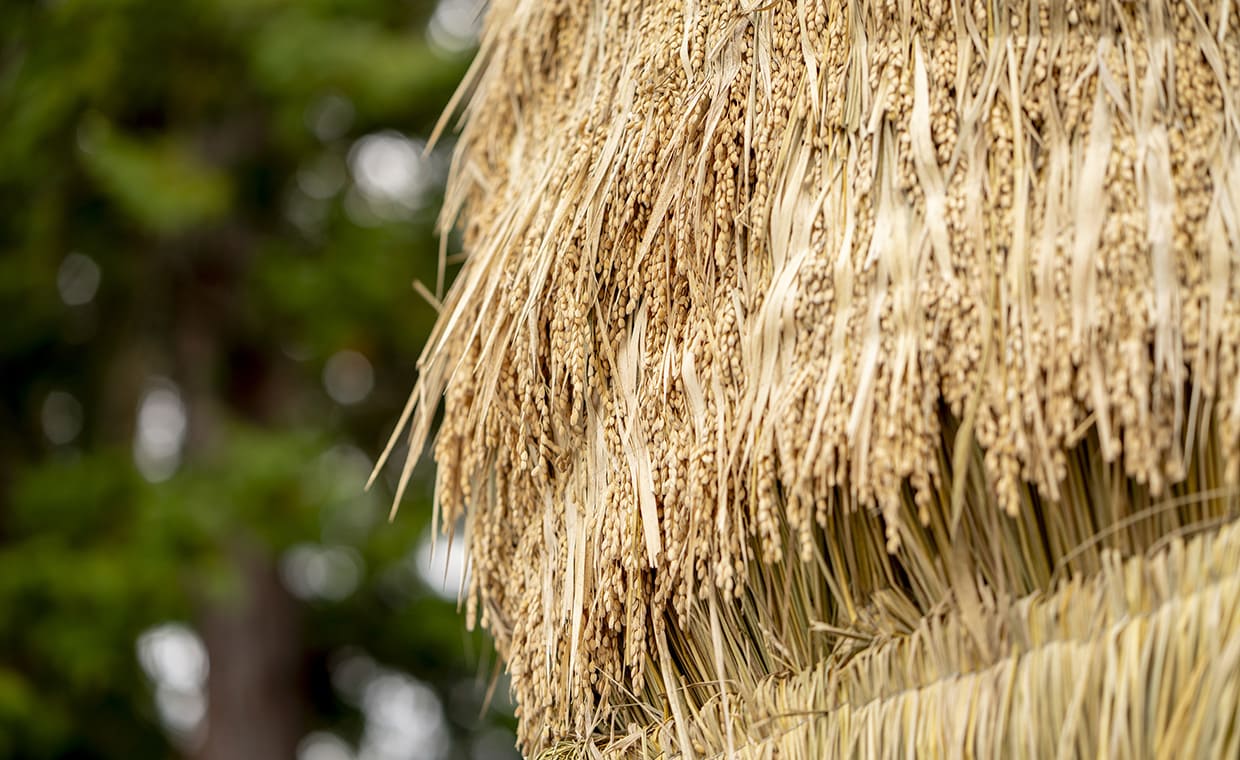 約1反の田んぼで干支飾りのためだけに育てられた酒米を「実り多い一年になりますように」という願いを込め、わらでなく米が実った稲穂をぜいたくに使用しているところにも要注目。
